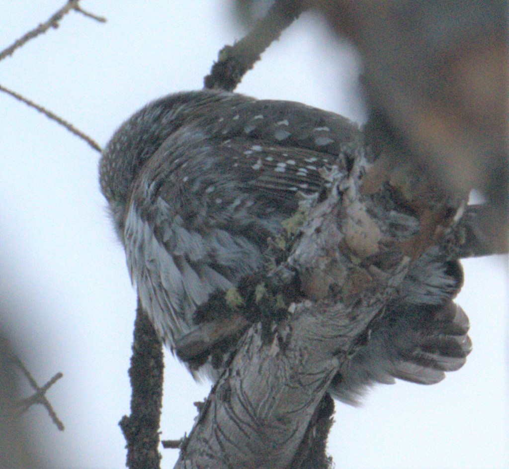 2022 – day 1 – up before dawn – excited about the day ahead. We plan to search for wolves in Yellowstone. But I know for certain I will have my eyes out for the birds as well. And to my delight, as the sky lightened and the sun graced the horizon, I looked up to see an Eagle flying over. First bird of the new year was a majestic Eagle, in flight no less! As we entered the Northeast gate of Yellowstone a group of 5 Rosy-finches welcomed us. Seeing a Rosy-finch is a first for me so I am definitely loving the start to this day!! I saw my favorite bird – the American Dipper, some Mallards, Magpies, Ravens, Canada Jays, and a Mountain Chickadee. But the highlight of the day was seeing a Pygmy Owl!!Another first for me!!! (2 lifers in one day!!) She was perched high up in a distant tree. When I say the Pygmy Owl is small, I mean tiny!!! They are one of the smallest owls measuring around 6 inches. They are small, but definitely mighty. They feast on other birds sometimes more than twice their size. While the other birds that I mentioned above were pretty easy to spot, the Pygmy was a little more elusive. Besides being so small, she also decided to take flight after first being spotted. Since this was my first sighting of a Pygmy, I wanted another chance to see this gem of a bird. I had an idea of which tree she flew to, so I got out of the car and walked down the road a bit. There she was! (I should point out that the temperature was minus 20!) There she sat with her back to me. I waited and waited and waited – please little owl just turn around, I would love to see your incredibly beautiful face. I waited and waited. (The rest of the gang stayed in the car). So there I was standing in sub-zero temperatures hoping the Pygmy would cooperate and turn around. Did she?